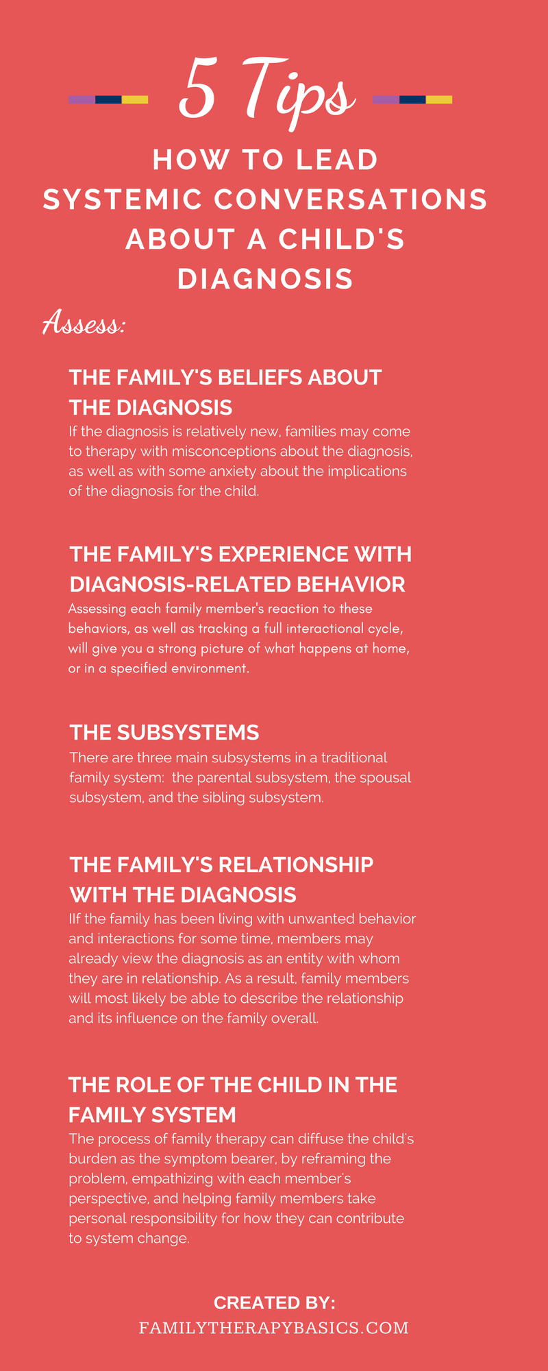 Therapy involving children will often lead to conversations with parents about a child's diagnosis, or potential diagnosis. Whether or not you diagnose regularly, failing to assess and discuss a diagnosis as well as its impact on the family system means ignoring a significant element in the family's day-to-day interactions. Additionally, bringing diagnosis conversations into family therapy allows all family members to voice the influence of the diagnosis on his/her perceptions of the behavior and the diagnosed child.